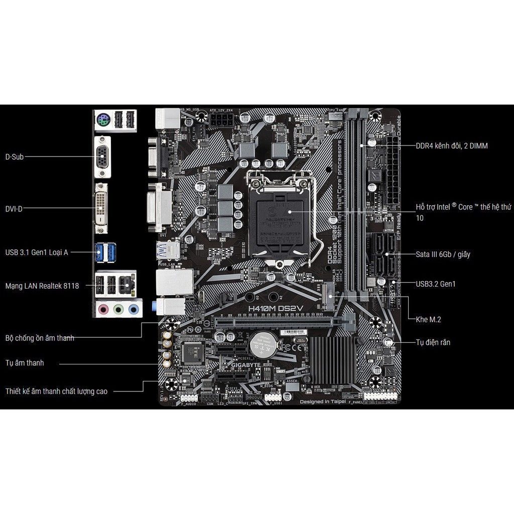 Mainboard Gigabyte H410M-DS2V là dòng bo mạch chủ phổ thông, sử dụng chipset H410 và socket LGA 1200 của Intel.